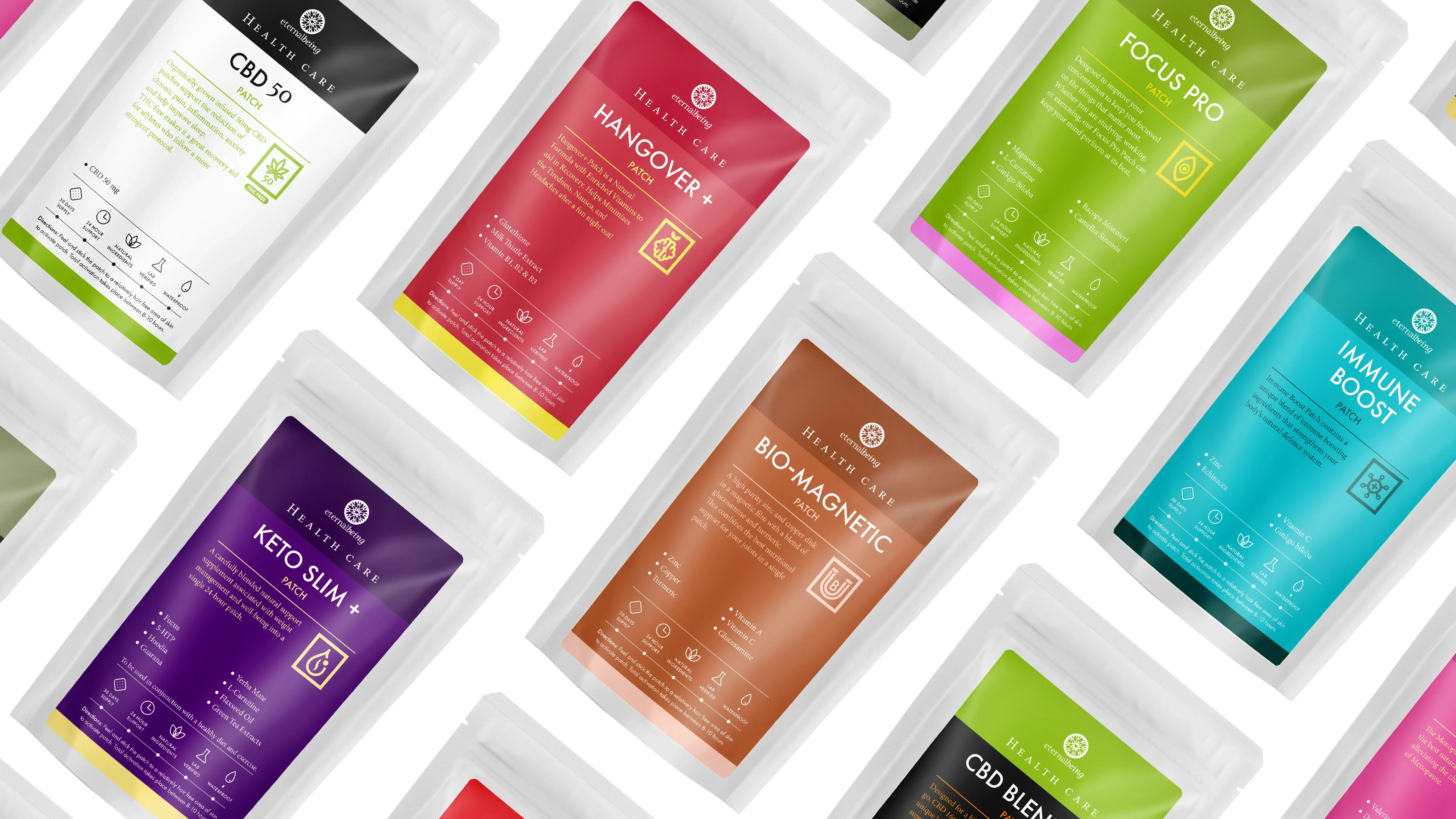 To design a premium, cohesive packaging system that embodies Eternal Being’s holistic values, enhances brand recognition, and ensures visual consistency across their product line.